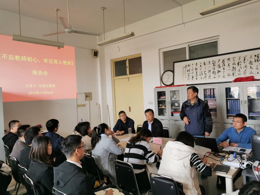 王旭光教授结合自己当工人、上大学、担任大学教师的人生经历,与参会人员分享了自己对生活、工作、人生的感悟和对初心与使命的理解。认为作为大学教师的初心和使命在教书育人、立德树人,培养社会主义建设者和接班人。王教授指出,当好工科大学教师不能急功近利,要有团结协作精神,要热爱学生,热爱教育事业,还需要下功夫过“教学观”、“科研关”、“工程关”,让学生记着你、敬佩你。王教授表示,中国改革开放40年巨大变化,自己是参与者、建设者,最终实现了“中国不能制造”变成“中国制造”的改变,希望新一代青年教师能够继续前行,努力培养好学生,将“中国制造”更多的变成“中国创造”。