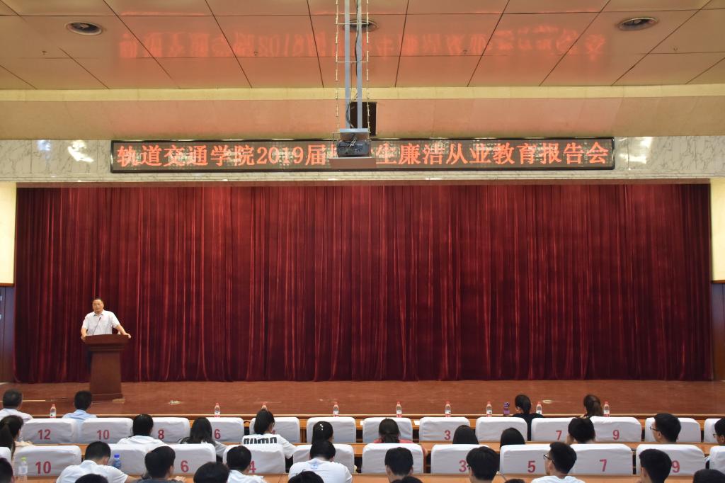 为增强同学们的法制观念,提高廉洁意识,使毕业生入职之前在心中种下廉洁、诚信、守法的种子,走好未来人生之路。6月14日上午,轨道交通学院在学校学术报告厅举办了2019届毕业生廉洁从业教育报告会。学校党委委员、纪委书记范玉斌为轨道交通学院全体毕业生做了题为“坚守纪律法规底线,走好未来人生之路”报告。