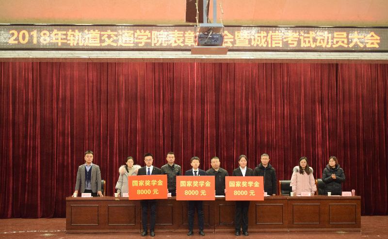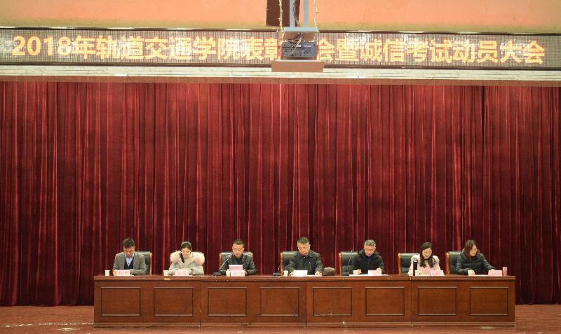 为表彰先进,树立榜样,更好地发挥优秀学生的带头和示范引领作用,2019年1月2日,轨道交通学院在长清校区学术报告厅举办了2018年轨道交通学院表彰大会暨诚信考试动员大会。轨道交通学院党总支书记宿林林、副院长张良智、团总支书记赵锋、2015级辅导员任洺萱、2016级辅导员李晔、2017级辅导员李以然、2018级辅导员宋彦慧出席了本次活动,共550余名学生参加了本次活动。本次活动由团总支书记赵锋主持。