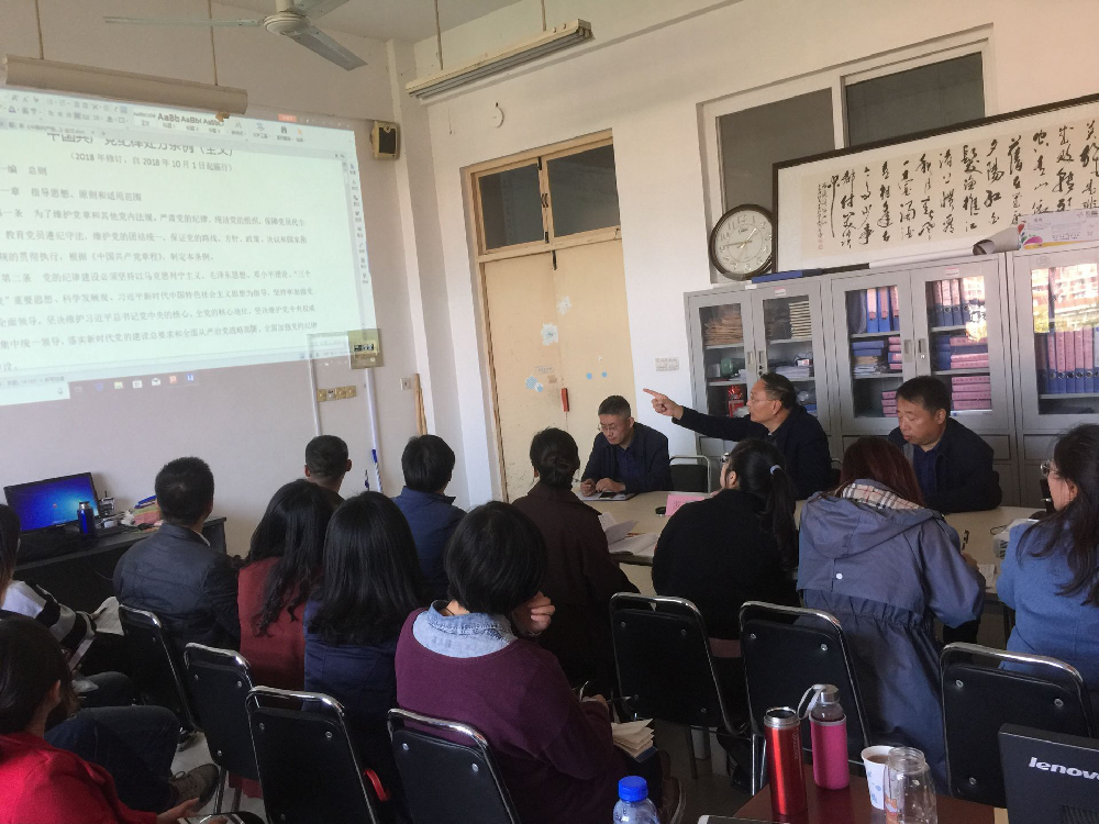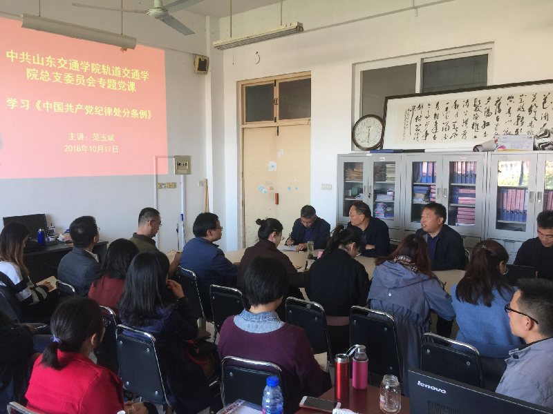 为落实学校党委关于认真学习贯彻《中国共产党纪律处分条例》的通知要求,2018年10月18日下午,学校党委委员、纪委书记范玉斌在1A410为轨道交通学院全体教职工党员上了一堂学习新修订的《中国共产党纪律处分条例》专题党课。学院党总支书记宿林林主持学习活动。