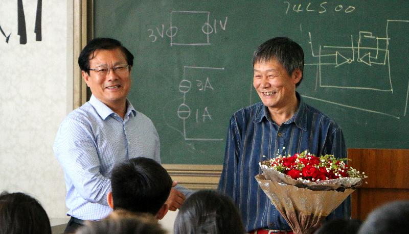 一束鲜花谢师恩。在王旭光教授最后一节课临近尾声时,学生代表向王教授献上鲜花,在教室听课的孔祥云在同学们的掌声中与王教授亲切握手,送上祝福并向其颁发返聘证书。王教授说,自己在工作的43年中,同龄的知识分子们做的最伟大的事业就是把中国由“不能制造”变成了“能够制造”,自己参与其中,感到非常自豪。经过几十年的努力,中国的制造业正向着高端化、信息化、服务化、智能化、绿色化的发展方向不断前进。今天,冲锋陷阵的重任落在了青年学生们的肩上,希望广大同学努力学习,担负起时代的重任,把中国制造变成中国创造,在自动化的基础上搞好信息化、智能化,为轨道交通行业的发展贡献力量。