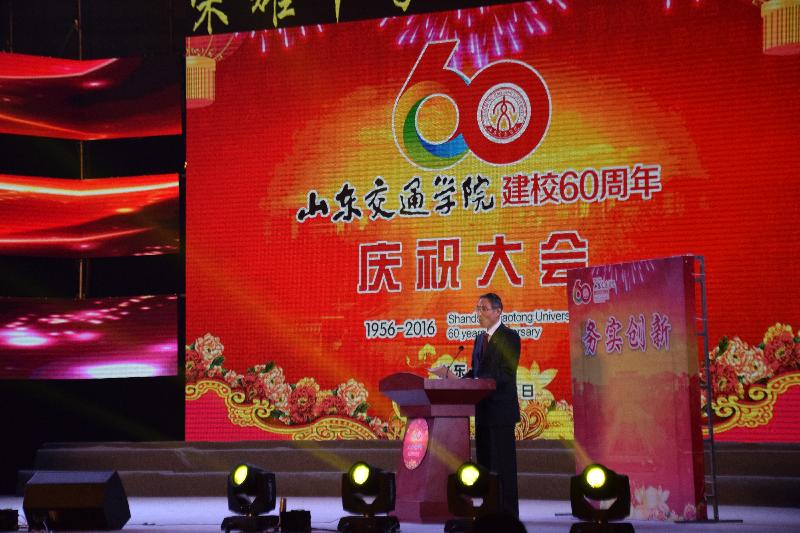 会上,院长鹿林发表了演讲,他在致辞中回忆了交院过去风雨征程的六十载,同时展望了交院的未来:争做全国优秀的应用型特色名校;党委副书记唐勇宣读了山东省教育厅发来的贺信,信中传达了热烈的祝贺和美好的祝愿;山东省交通运输厅副厅长司家军在发表的演讲中,除祝贺交院六十华诞之余更感谢交院为交通运输行业培养了众多的人才;国内兄弟院校代表和俄罗斯合作院校代表也分别发表了讲话,对山东交通学院寄予了祝福,同时表达了希望与交通学院能更加密切的合作学习。