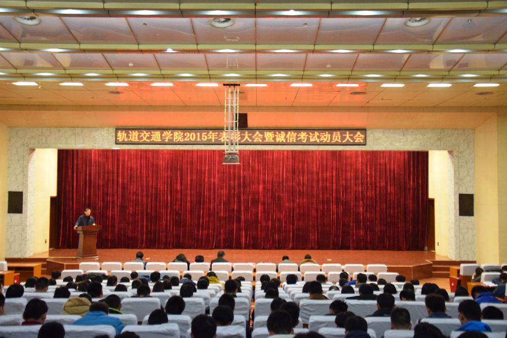 12月29日,轨道交通学院在长清校区报告厅举行了2015年轨道交通学院表彰大会暨诚信考试动员大会,我院党总支书记宿林林、院长阮久宏、团总支书记张秋红、办公室主任刘建磊、辅导员陈聪聪、宋亚威、李璐出席了本次会议。