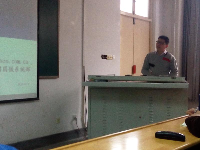 2014年11月11日,上海卡斯柯信号有限公司国铁系统部张焕增莅临轨道交通学院,在长清校区一号教学楼A座102教室为轨道交通信号与控制、轨道交通运营与管理两个专业的14级同学开展了以铁路调度指挥系统介绍为主题的讲座。13级辅导员陈聪聪老师出席本次讲座。